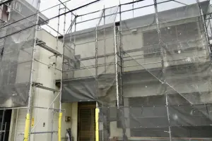 1つ目は、塗料や汚れの飛散を防止する役割です。これは「飛散防止ネット」と呼ばれ、主にメッシュシートでできています。夏場の施工でも通気性があります。綺麗な仕上がりにするために必要なものですが、それ以外にも近隣の建物への飛散防止にもなっています。台風など風が強い時は、飛ばされないようにしっかり結ぶか取り外すようにお願いしましょう。